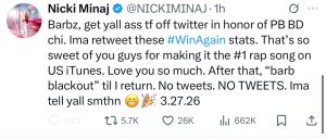 On one side of the conversation, Nicki Minaj—through fan engagement and indirect messaging—celebrated her latest achievement, with her track “Win Again” reaching #1 on the US iTunes rap chart that a very good achievement. Her Text to the Barbz (her heated fanbase) urged them to step back from Twitter as a show of unity and respect for her friend’s birthday (“PB BD chi”) lol. This moment of celebration was marked by her connection to her fans, whom she often directly communicates with. Her announcement of a temporary “barb blackout” served both as a promotional strategy and a symbolic retreat amid growing online dispute.