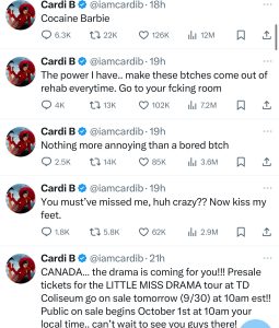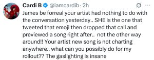 In summary, Cardi B responded to an unrelated but parallel rumors, directly calling out an individual named James and defending herself against what she see as an unfair framing of events. Cardi B accused others of gaslighting and misrepresenting the timeline of actions—arguing that another artist (implied to be Nicki Minaj) initiated the tension by tweeting an emoji and teasing music in a provocative sequence. Cardi B also pointed out that the other artist’s new track isn’t charting successfully, lol casting doubt on their hype to her own rollout and promotion plan.